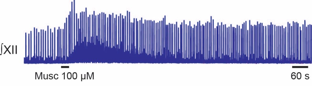The rhythmic slice produces breathing behaviour which can be influenced by injection of neuromodulators like muscarine